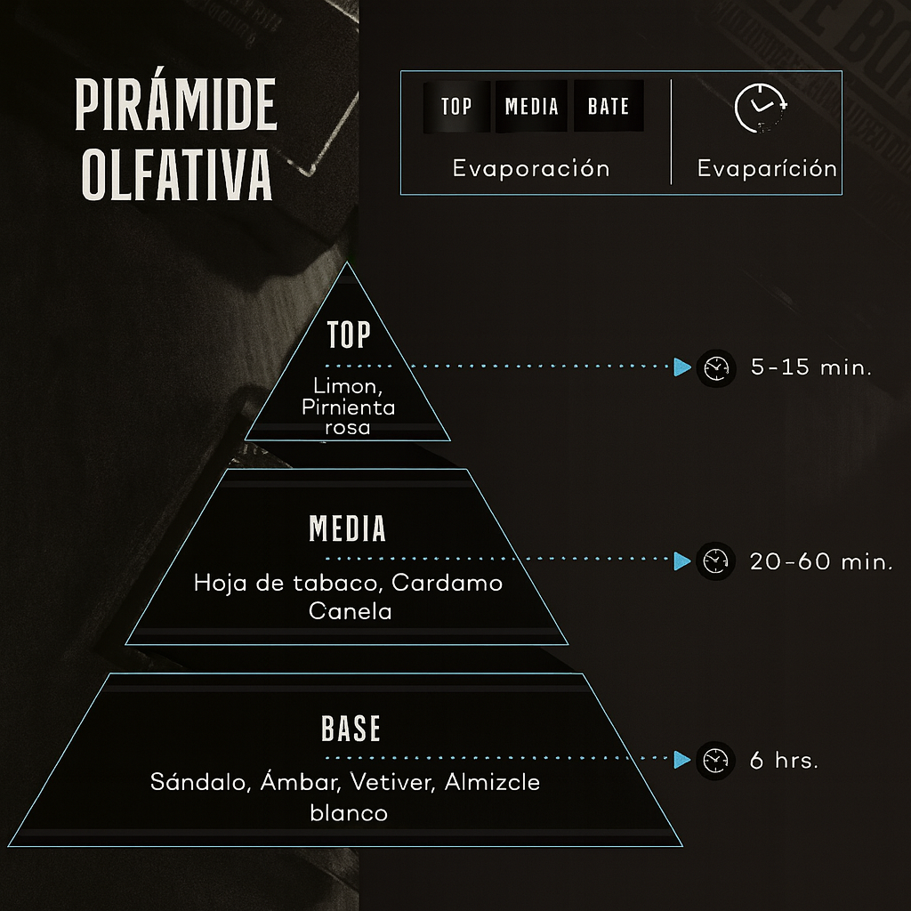 Finalmente, las notas base de ámbar, sándalo, vetiver y almizcle blanco permanecen por horas en tu piel (6+ hrs), dejando una estela inolvidable.